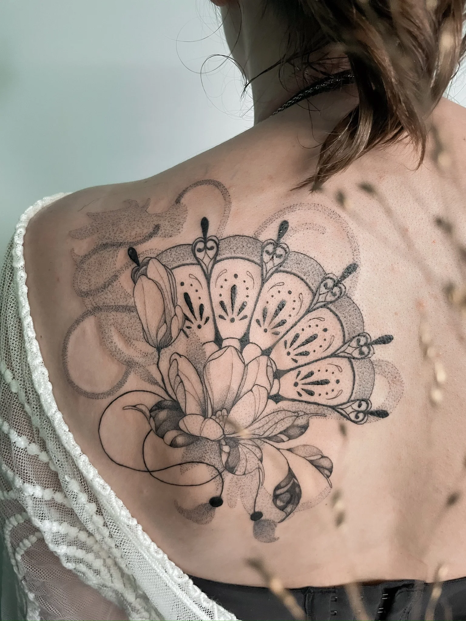Je crée des motifs floraux, animaliers et ornementaux en harmonie avec le corps. Pour moi, le tatouage est comme un bijou qui nous aide à nous approprier notre corps. Avec des lignes fines et une multitude de détails, mon univers est poétique et féminin