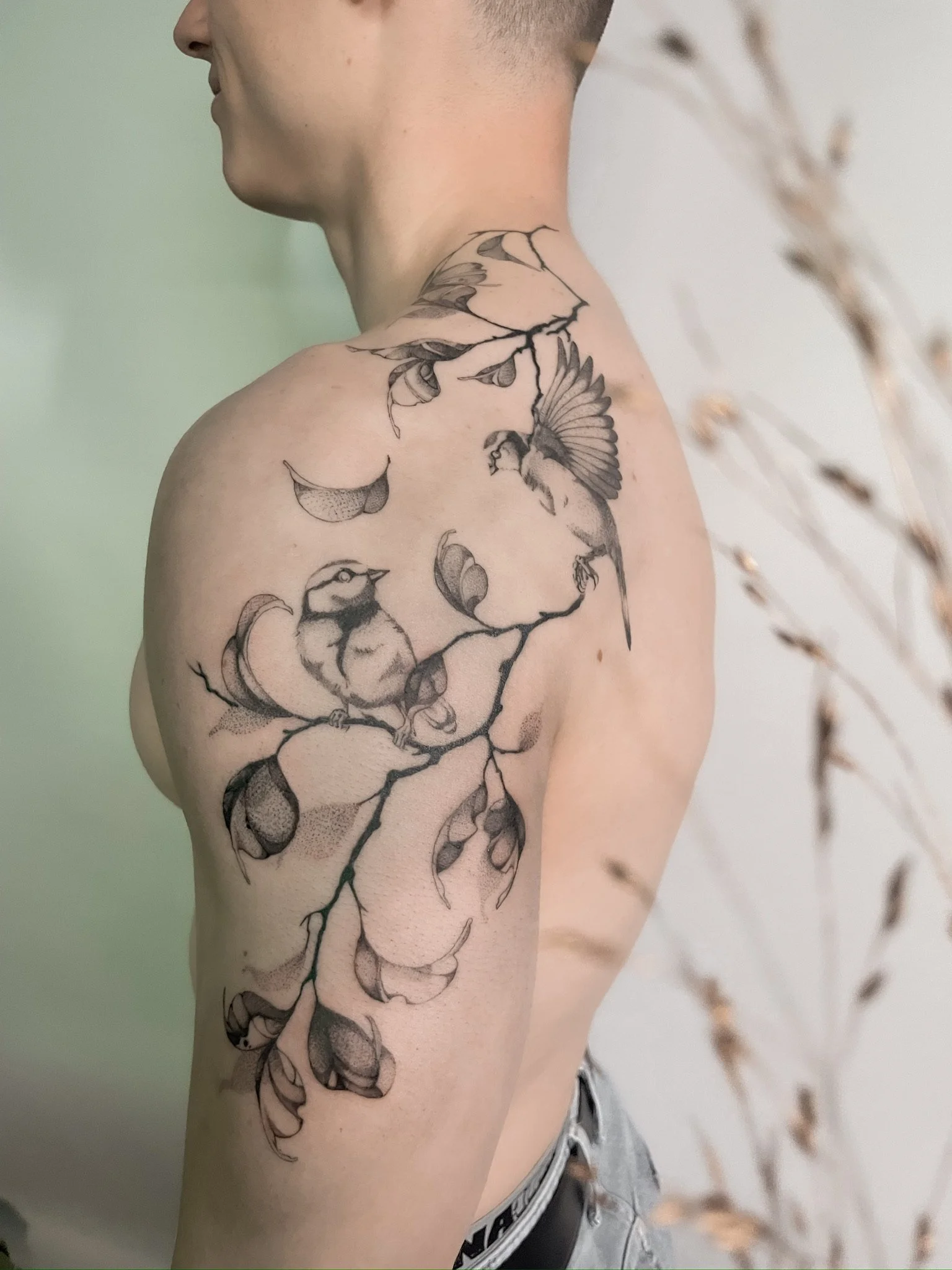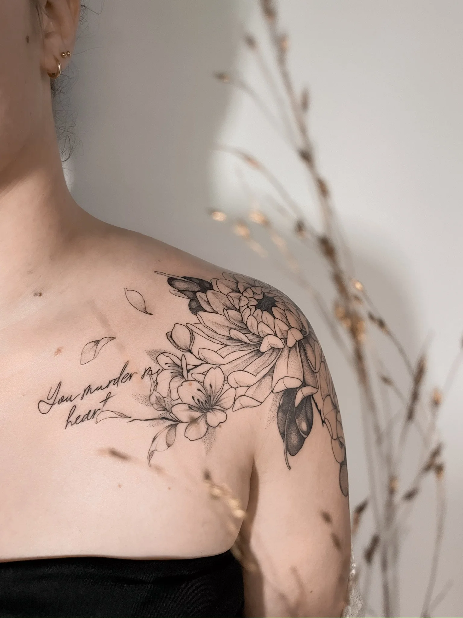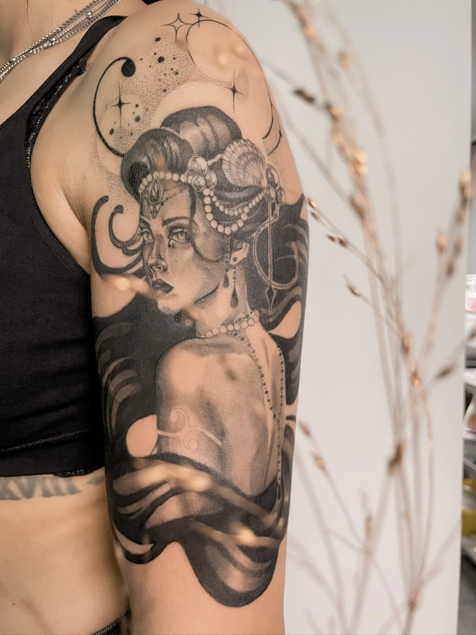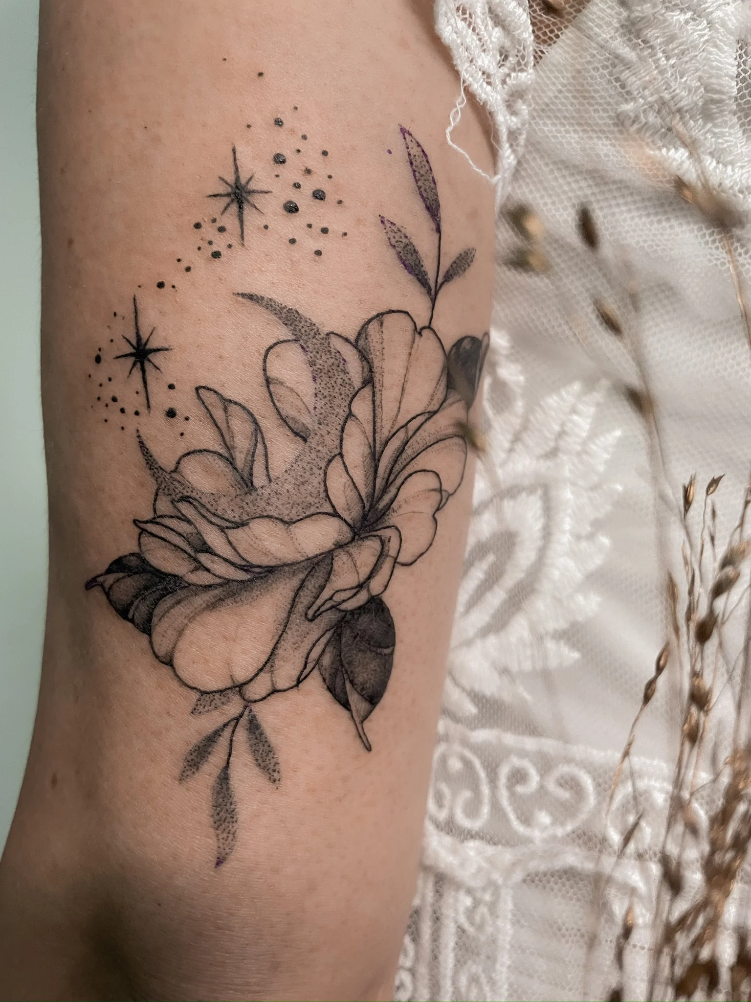 Mon style de prédilection est d'inspiration art nouveau, néotraditionnel, et ornemental en blackwork. Je fais souvent des animaux et des motifs floraux. J'aime aussi m'adapter à vos envies et votre projet !